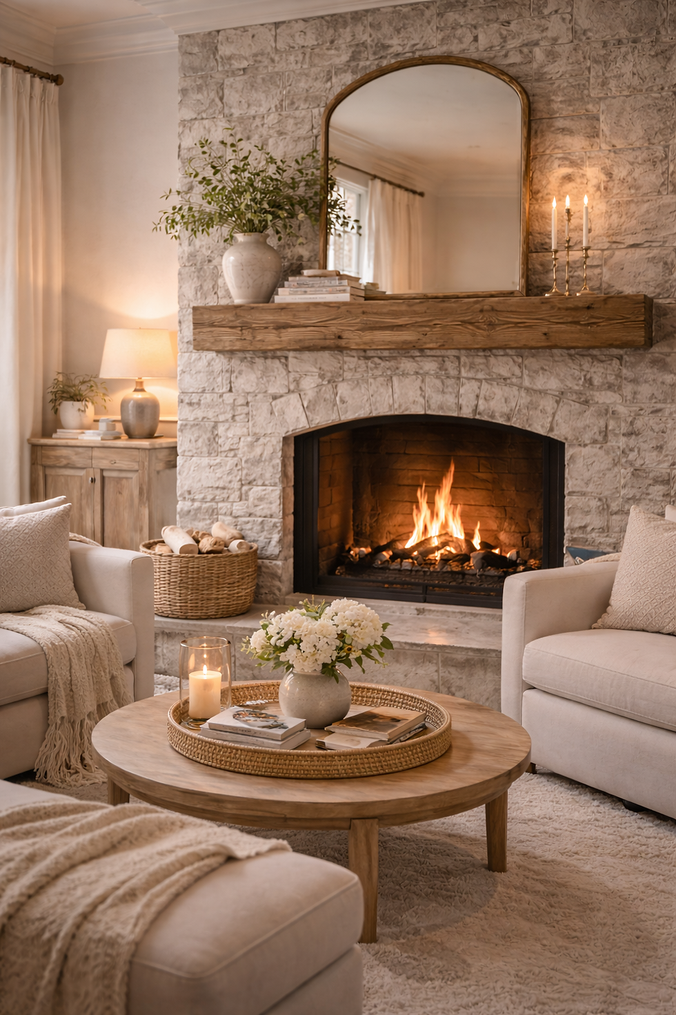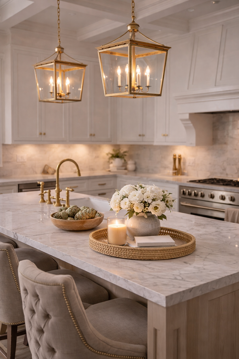 Choose one surface — your coffee table, kitchen island, or entry table — and style it intentionally: • a tray• a candle• a small plant or book